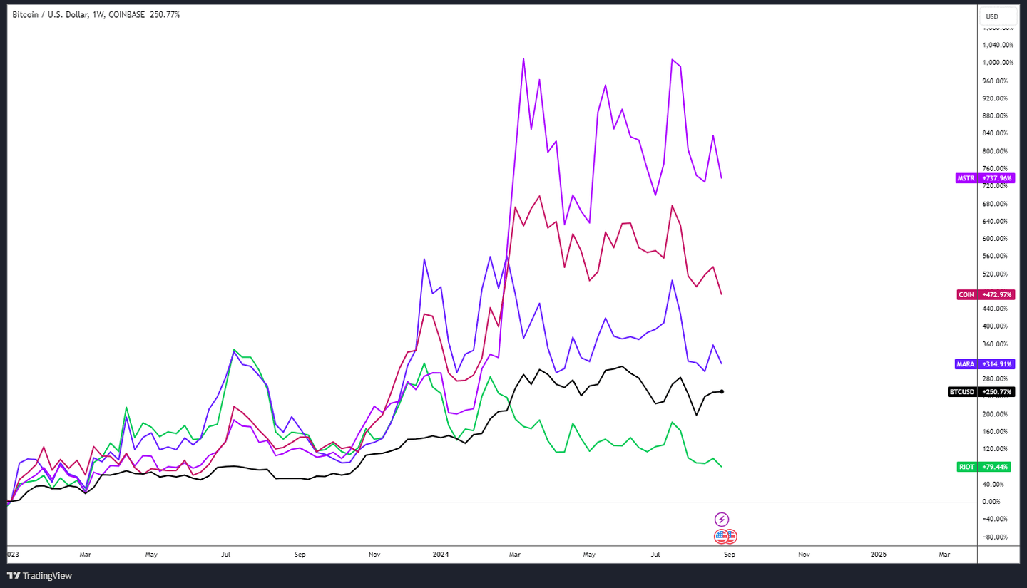 If you compare the price performance of Bitcoin with the aforementioned alternatives on the stock market, you can see that MSTR, COIN and MARA have performed significantly better than Bitcoin itself since January 2023. At the time of writing (August 28, 2024), MSTR has performed the best with +730 percent, COIN is in second place with +470 percent, followed by MARA with +310 percent, and Bitcoin itself is up 250 percent since the beginning of 2023, followed by RIOT in last place with +80 percent.