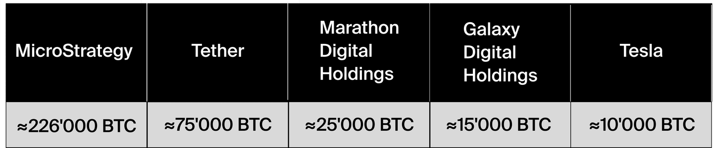 As we can see, there are no big surprises among the top 5 companies with the most bitcoins. Nevertheless, it is interesting to see that the crypto-native companies (Marathon Digital Holdings and Tether) are already outnumbered in the top 5 today. I wonder what this will look like in five or ten years’ time.