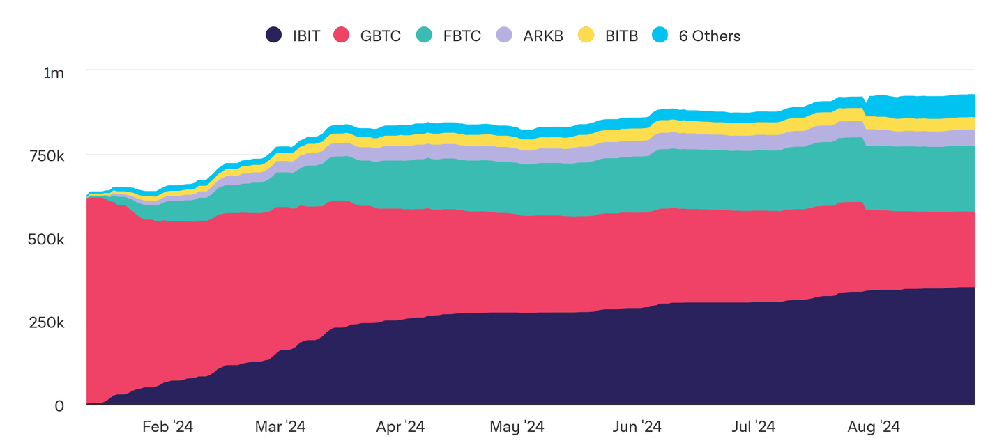 Since January 11, 2024, investors worldwide have enjoyed the opportunity to invest in Bitcoin via the infamous spot ETFs. The largest holders of BlackRock's Bitcoin Spot ETF (IBIT) include Millenium Management, the Goldman Sachs Group, Jane Street Group, Morgan Stanley and the State of Wisconsin Investment Board. The sheer amount of bitcoin held by the issuers of these Bitcoin spot ETFs on behalf of their clients is enormous. For example, BlackRock holds 347'000 BTC on behalf of their clients, Fidelity holds 289'000 BTC, Grayscale holds 264'000 BTC, and ARK Invest holds 44'900 BTC. In total, all Bitcoin spot ETFs currently hold almost 1 million bitcoins; BlackRock and Fidelity thus hold more than half of this amount, as illustrated in the chart below.