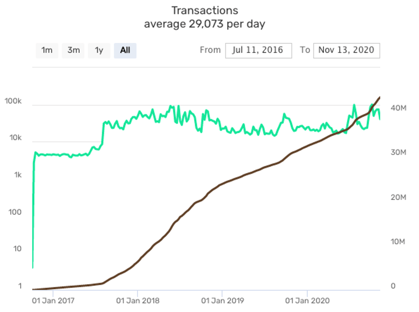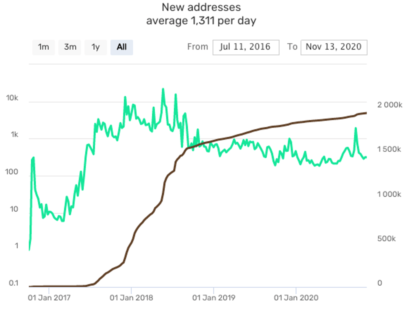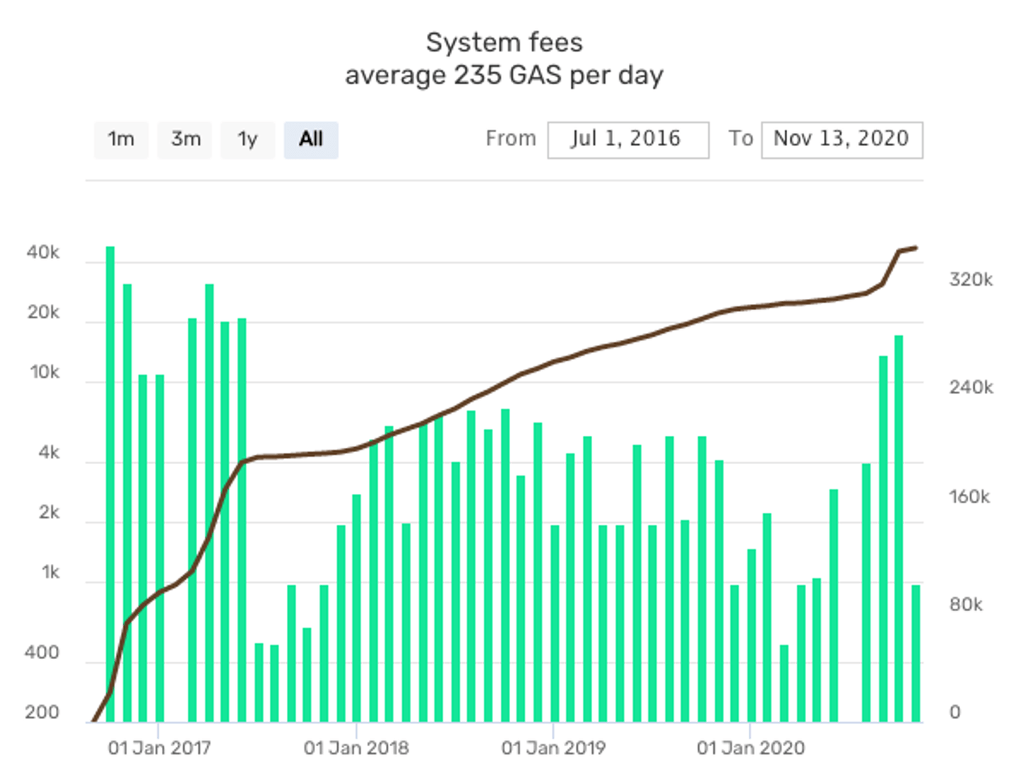 Figure 2, 3, 4, and 5 reveal general user activity on the Neo2 blockchain under different metrics. The green lines show daily values while the dark lines represent the accumulated value over time.