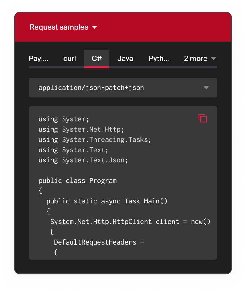 Use C#, Java, Python, JavaScript, GO or any language that can handle web requests. If you need further assistance, simply reach out to your dedicated relationship manager.