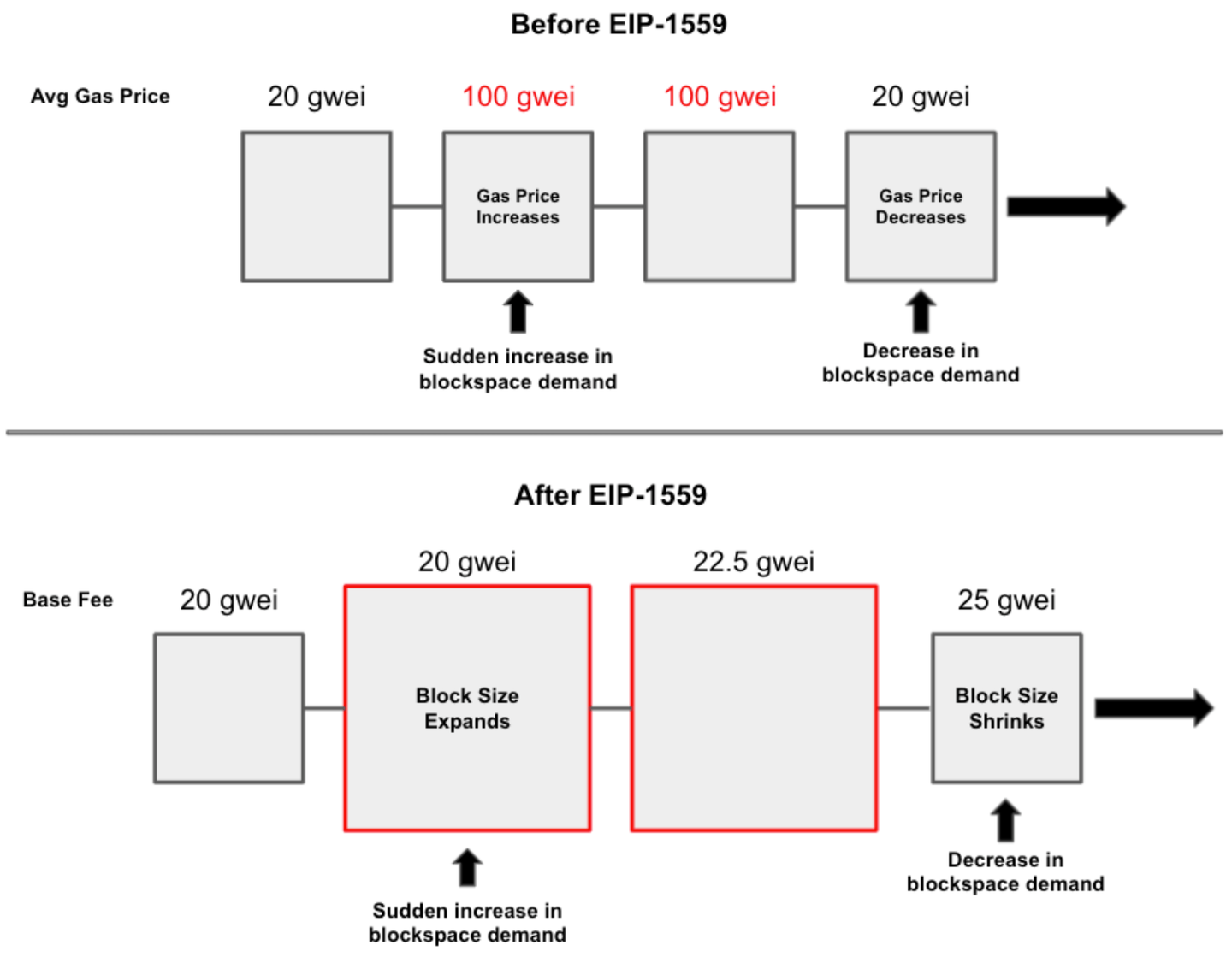 - Während sich EIP-1559 hauptsächlich darauf konzentriert, die Nutzererfahrung von Ethereum zu verbessern, indem es die Volatilität der Gaspreise in eine Volatilität der Blockgrössen umwandelt, verbrennt es auch einen Teil der Transaktionsgebühren und stellt somit eine Verbindung zwischen ETH und der Nachfrage nach Transaktionen auf Ethereum her.
