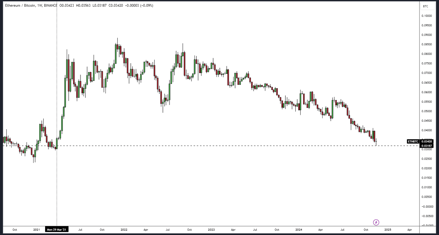 Werfen wir einen Blick auf den oben erwähnten Ethereum-vs.-Bitcoin-Chart. Zum Zeitpunkt der Erstellung dieses Artikels wird Ethereum bei 0,034 gehandelt, ein Niveau, das zuletzt in der Woche vom 29. März 2021 erreicht wurde. Damals wurde Ethereum bei etwa 2'000 US-Dollar getradet, während Bitcoin bei etwa 60'000 US-Dollar lag.