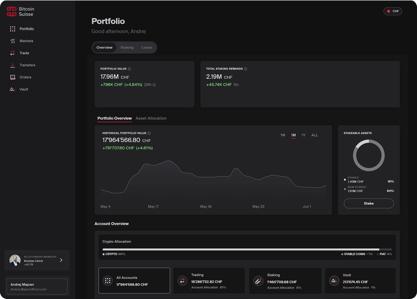 Our most popular custody option, the Bitcoin Suisse Crypto Account, offers clients fast, convenient and secure access to their crypto 24/7. Crypto assets are either segregated on our proprietary cold storage solution, the Bitcoin Suisse Vault, or covered by a bank guarantee issued by a Swiss bank.