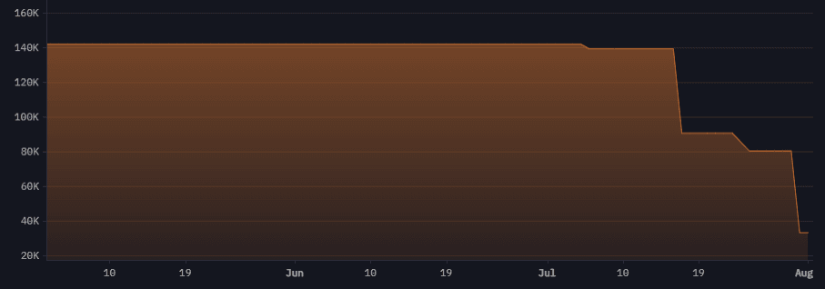 The repayments from Mt. Gox were a hot topic again this week. It started on Tuesday with a couple of test transactions and accelerated on Wednesday when a Mt. Gox address moved roughly 34’000 BTC to addresses belonging to the crypto custodian BitGo, according to Arkham. BitGo seems to be the fifth and final custodian, working with the Mt. Gox trustee to return BTC and BCH to creditors. Mt. Gox communicated on July 31, that they have now made repayments to over 17’000 rehabilitation creditors to date. According to Arkham, the Mt. Gox wallets now hold a total of 33’000 BTC, down from over 140’000 BTC at the beginning of July. You can track it here.
