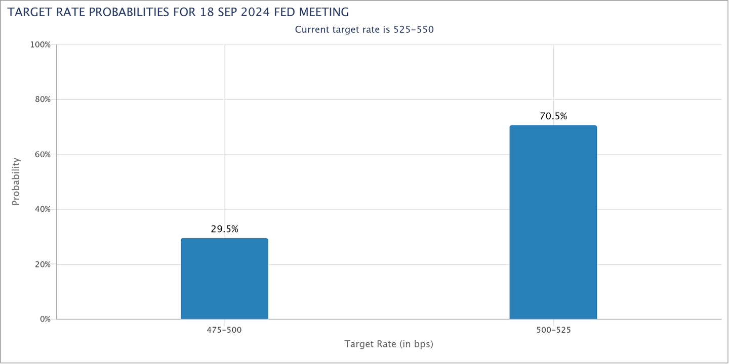 When looking at the expectations for the September meeting, target rate probabilities show that market participants are expecting rate cuts, with 70.5% expecting a cut of 25 bps and 29.5% expecting a rate cut of 50 bps, as seen in the chart below.