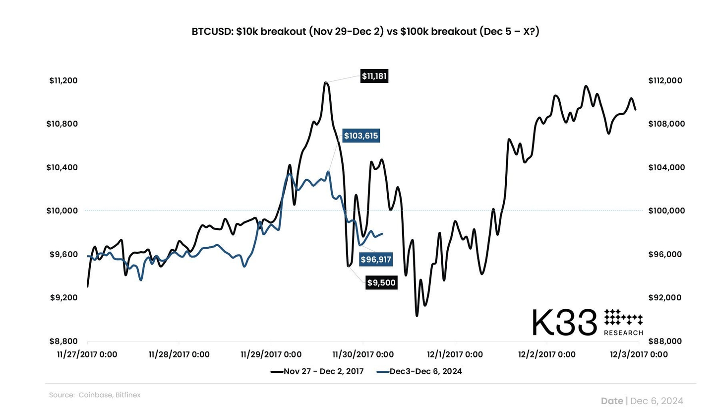 Of course, we have to take a closer look at bitcoin’s $100’000 break this week. Our colleague from K33 Research has published a nice chart comparing bitcoin’s $10’000 breakout from 2017 to yesterday’s $100’000 breakout. And who would have guessed – they are very similar to each other.