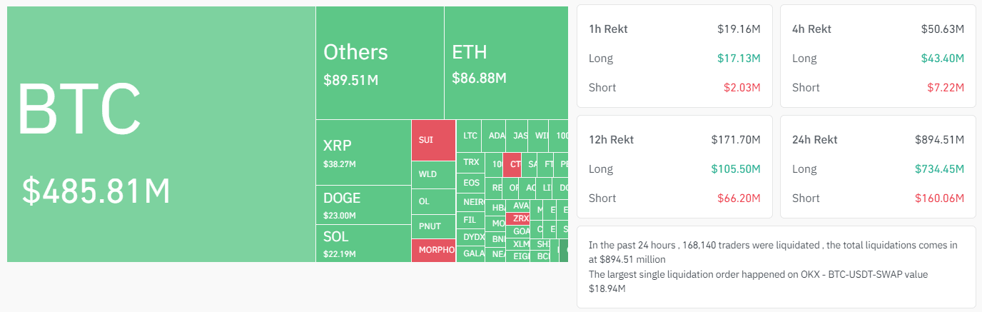 We were kind of surprised when we checked the crypto fear and greed index this morning. Of course, Bitcoin did wipe out quite a bit of leverage in the market last night, but it's still surprising, that we are down from extreme greed levels yesterday and are in greed (72) today. A total of almost $900 million in leveraged positions was liquidated during the last 24 hours. Bitcoin liquidations amount to more than half of it – also not something we see too often.