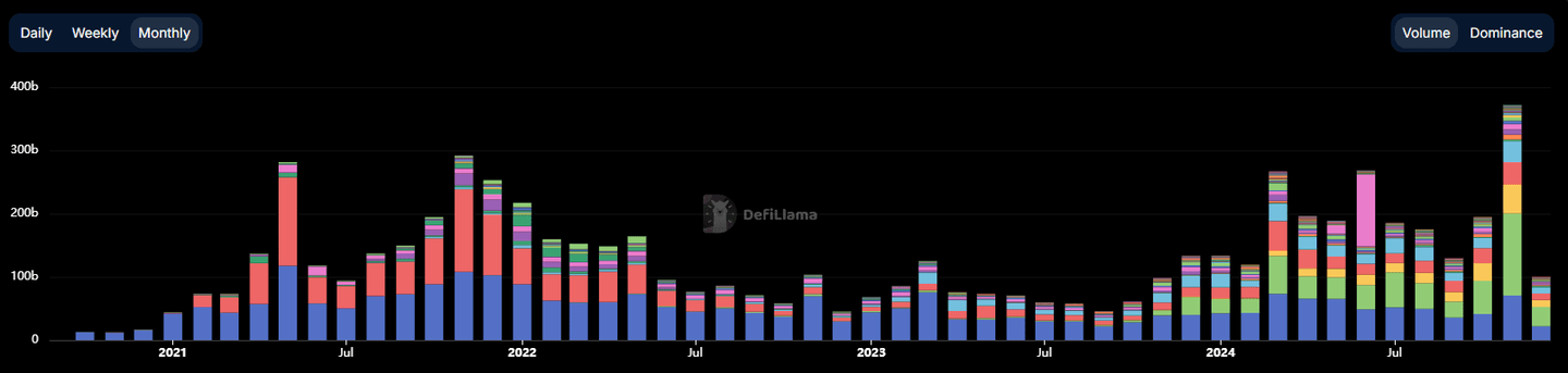 According to DeFiLlama, multi-chain DEX transaction volume reached $372 billion in November, a record high by a large margin. Of this, decentralized exchanges on Solana accounted for 34.85 percent of the market share, reaching $129.66 billion, while DEXs on Base achieved $45.74 billion—both setting new all-time highs. Ethereum contributed roughly $70 billion, placing it in second place after Solana, with a market share of around 19 percent.