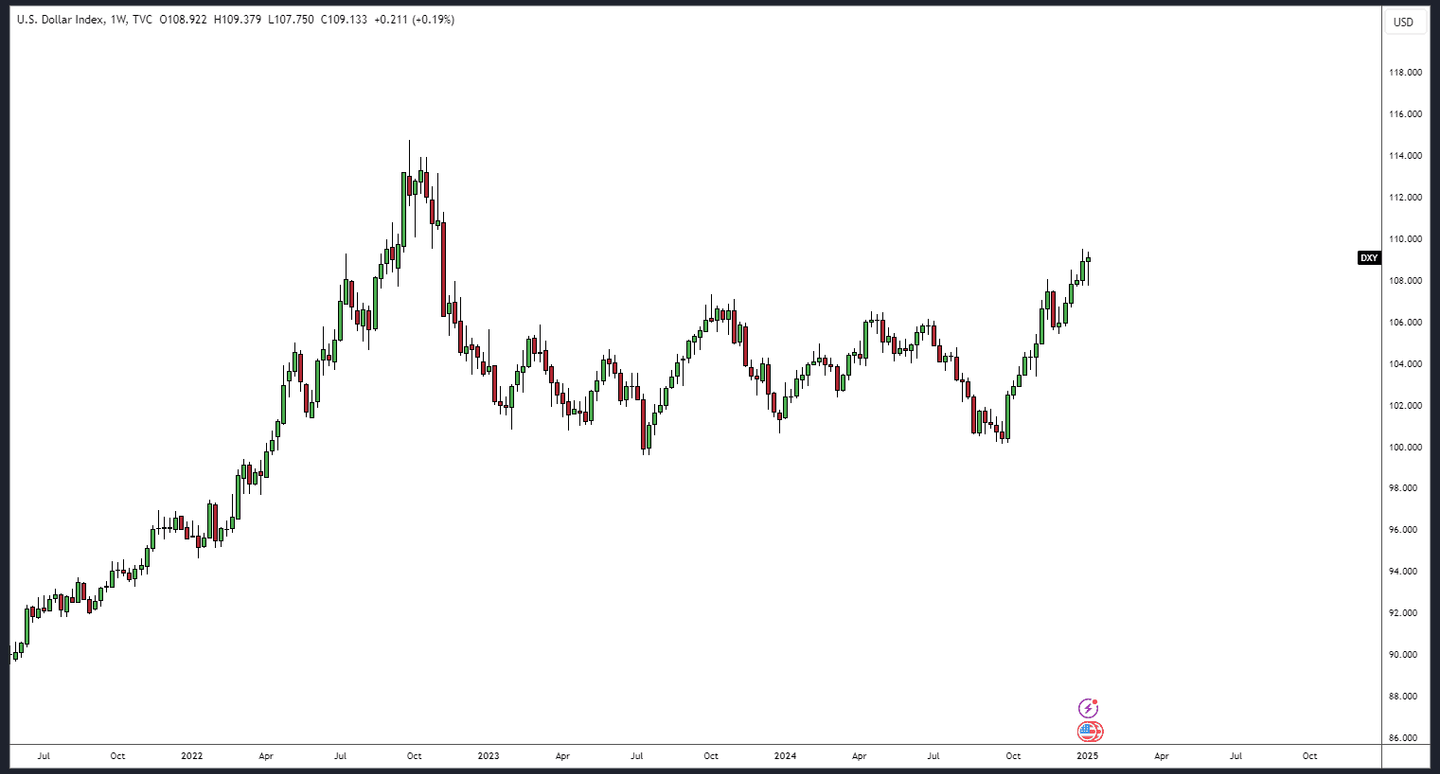 The U.S. Dollar Index has been on a tear in recent months, reaching new multi-year highs. Currently trading at 109, the index is up almost 10 percent since the end of September 2024. Historically, risk assets such as the S&P 500 and bitcoin have not performed particularly well during periods of U.S. dollar strength. However, the last few months have been an exception, likely due to the U.S. presidential election in November.