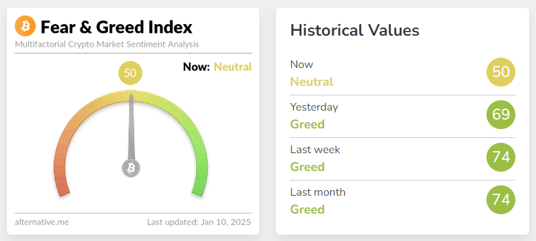 While the stock market has remained in fear territory (currently at 32) since our last update in December, the crypto market sentiment briefly climbed to Greed levels for a couple of weeks but has since dropped back down into the Neutral zone, standing at 50 today.