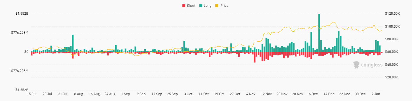The funding rates for major cryptocurrencies have remained at muted levels since last spring. They only began to show some signs of overheating in early December but have since returned to muted levels for almost a month. The total liquidations chart also reflects this trend, showing no particularly high liquidation events over the last two weeks. While this week saw nearly $1.5 billion in liquidations, that figure was reached in a single day back in December. Similarly, during the correction before Christmas, total liquidations were higher than they have been this week, as shown in the chart below.