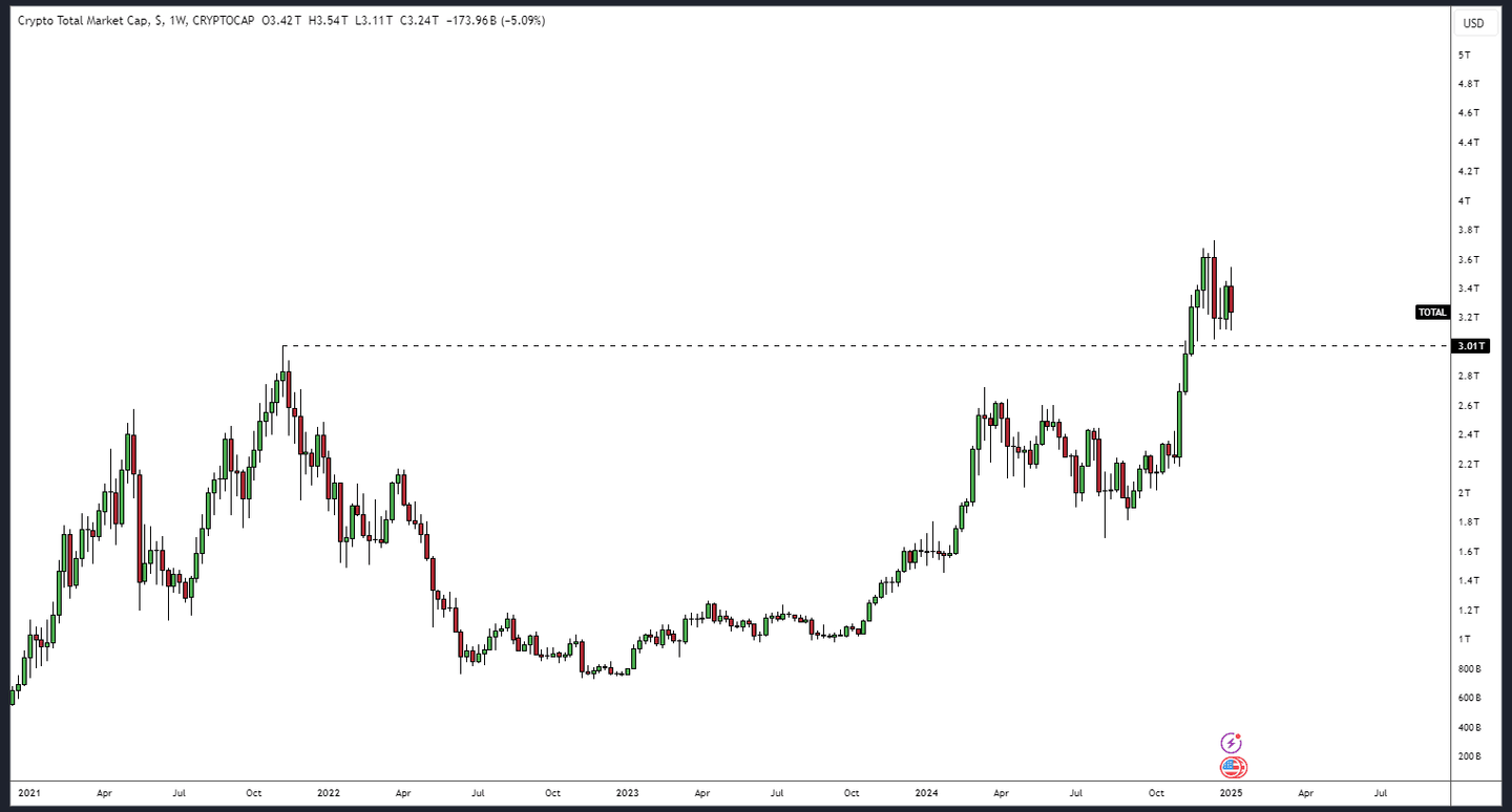 The total crypto market capitalization remains above $3 trillion at $3.23 trillion, down 13 percent from its high in December. The $3 trillion level is one to watch, as it marked the last cycle’s high at the end of 2021.