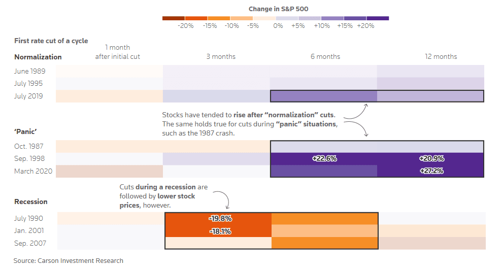 The chart below provides us with some more detailed insights into rate cuts as they differentiate between ‘normalization’, ‘panic’, and ‘recession’ cuts. As mentioned above, cuts during a recession are followed by lower stock market prices, as the price action in 2001 or 2007 shows. For ‘normalization’ or ‘panic’ cuts, history paints a better picture, as the stock markets tended to rise after such cuts.