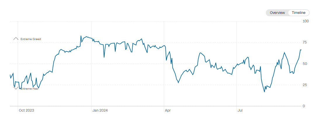Sentiment follows price action, and with the recent increase in price, it is no surprise that the crypto market sentiment moved out of the recent ‘Fear’ levels and is currently in ‘Neutral’ territory (54), which is currently still below the levels seen at the end of August, when Bitcoin was trading at these price levels before correcting to the downside. The stock market, on the other hand, is already back in ‘Greed’ territory, which makes sense, as it was ‘Neutral’ last week, when crypto was still fearful. The chart below shows the development of the CNN fear and greed index over the past year. The sentiment seems to have started a new uptrend over the last two months. It is also visible that the market can stay in ‘Greed’ or ‘Extreme Greed’ territory for multiple months, as has been the case from November to April, for example.