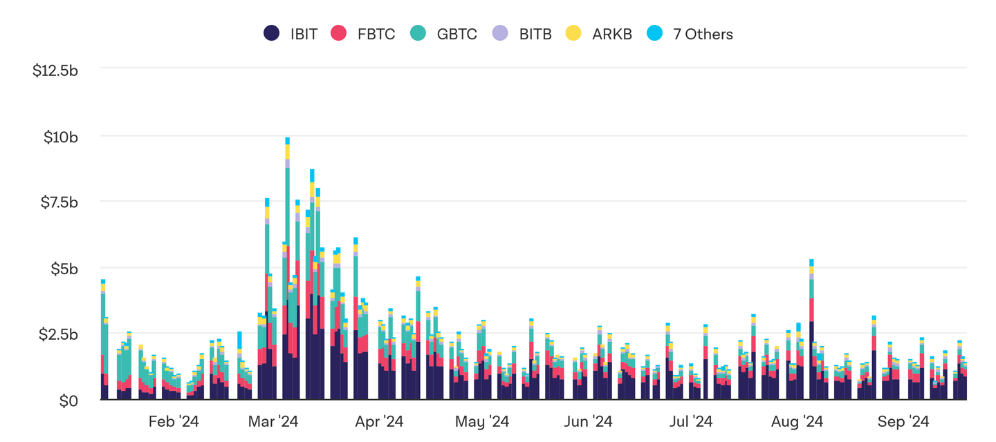 When looking at the Bitcoin spot ETF volumes, we can observe that the current volumes are still well below the March volumes, where the daily volume in USD was above $5 billion on a regular basis. The only day with a $5 billion volume since March was on August 5, when Bitcoin bottomed out at around $50’000.