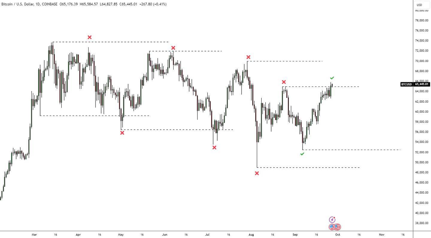 This week, we want to highlight a shift in the market structure of Bitcoin. Below, we have illustrated the recent price action since its last all-time high in March. As shown, Bitcoin experienced a series of lower highs and lower lows from March to the end of August. However, with the most recent low at the beginning of September, Bitcoin has, for the first time since March, recorded a higher low compared to the low in August. Today, Bitcoin has also reached a higher high compared to its last high at the end of August. This marks an interesting shift in structure, and we are now watching for another potential higher low above the most recent low from early September.