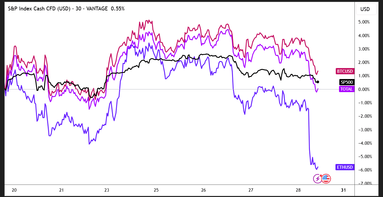 Overall, the crypto market continues to move in tandem with the U.S. stock market, as both remain in a state of uncertainty ahead of Trump’s tariff decision next week. The chart below reflects this market indecision and highlights ETH’s continued underperformance, with Ether down over 4 percent today at the time of writing.