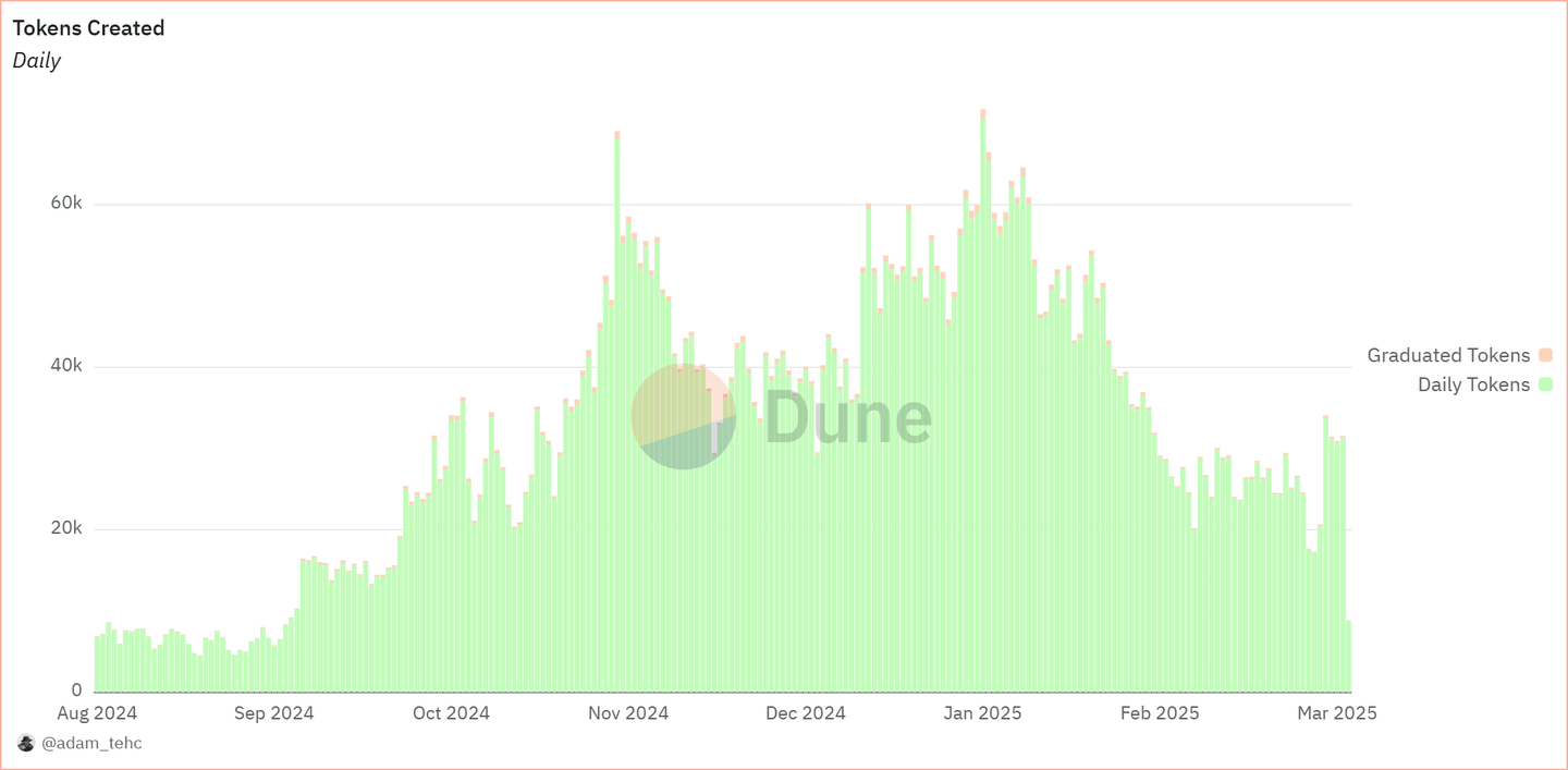 Since its inception, nearly 9 million tokens have been launched on Pump.Fun, generating over $600 million in total revenue. Interestingly, only four of these tokens – FART, PNUT, ACT, and WOULD – have maintained a market capitalization above $100 million. The total market capitalization of all tokens ever created on Pump.Fun currently stands at $3.3 billion, which is only 5.5 times Pump.Fun’s total revenue since its inception. The chart below shows the total tokens created per day since last August.